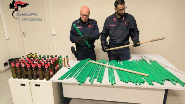 Sora – Bastoni fumogeni e bottiglie sequestrate dai carabinieri durante la partita Sora Avezzano. Si tratta di 52 bastoni della…