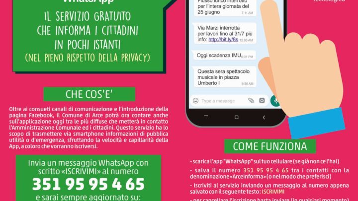 Arce – Il comune di Arce accorcia le distanze con i cittadini, arriva il servizio di messaggistica istantanea “Arce Informa”.…