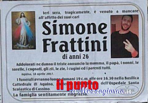 Aquino – Si svolgeranno domani alle 16.30 nella Basilica Cattedrale di Aquino i funerali di Simone Frattini, il 26enne morto…